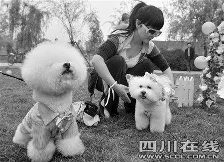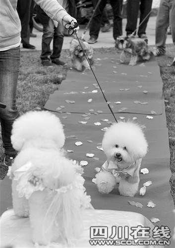 昨天下午3點,成都非物質(zhì)文化遺產(chǎn)國家公園內(nèi)響起了結(jié)婚進行曲,正當市民們駐足想看下新人的模樣時,兩只白色的比熊犬身穿鮮艷禮服走上紅地毯,突然闖進大家的視野。原來,它們就是這場婚禮的主角。13套豪華禮服,紅毯花房,“狗友”證婚還有入洞房等等,一樣都不能少。主人請人專門為狗狗策劃、舉行這么隆重的婚禮,數(shù)百在場市民對此褒貶不一……