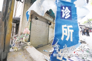 昨日,記者在現(xiàn)場(chǎng)看到,王氏診所位于前驅(qū)路公路邊一棟民房的底樓。診所卷簾門緊閉,在一張撕得零碎不堪的藍(lán)色布條上,寫(xiě)著“王氏按摩診所”、“推拿、按摩”等字樣。