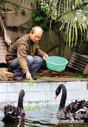 昨日,在北碚區(qū)施家梁鎮(zhèn)一院壩中,看著在池塘里悠閑游泳的黑天鵝,55歲的王國華愁眉不展。