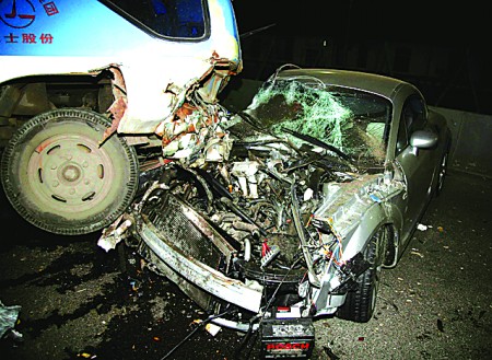7日零時10分許,一車牌為魯BME5XX的奧迪TT跑車,在沿東西快速路由東向西方向行駛至三百惠附近時,因超車與前方一輛同向行駛的中巴車相撞,由于沖擊力巨大,兩車騰空而起飛出數(shù)米遠后墜地,落在一輛原本與中巴車并列行駛的出租車前!拔疫沒反應(yīng)過來,就聽到‘砰’一聲,兩輛車從天而降,落在我的車前方不遠處,我趕緊剎車。”事后接受交警調(diào)查的目擊者、一名出租車司機回憶道。據(jù)另一位目擊者王先生稱,當時他駕車以每小時90公里的速度行駛,只見一個銀灰色的影子從自己車后竄到前面,估計車速在每小時140公里以上,該車與前面的中巴相撞時,沒有采取任何減速措施,基本是踩著油門撞上的,隨后就見到一白色的影子被甩出奧迪車,摔在路上。