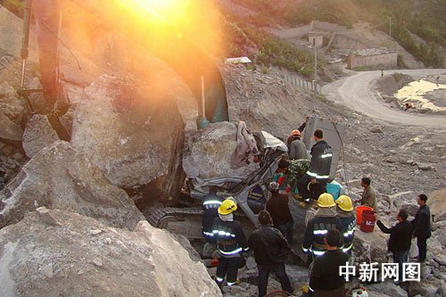 發(fā)生滑坡事故地點(diǎn)位于上屋采石場(chǎng)的半山腰,消防隊(duì)員攜帶破拆工具徒步上山。在現(xiàn)場(chǎng),挖掘機(jī)被兩塊巨大的石頭壓得面目全非,駕駛室已被壓得完全變形。一名40多歲的司機(jī)被牢牢壓在駕駛室內(nèi),為防止再次滑落,幾名工人用鋼釬將巨石牢牢頂住。