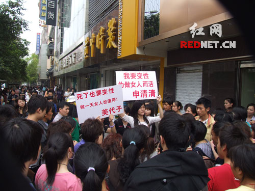 今日(4月13日)下午13時左右,記者收到網(wǎng)友線索,長沙黃興路步行街有兩個怪人舉著“我要變性”的標牌,圍觀的市民把路口堵個水泄不通。記者隨后趕到,發(fā)現(xiàn)其中一人正是前段時間頻頻曝光的“準”變性人申清清,另一個“怪人”則自稱“美代子”。