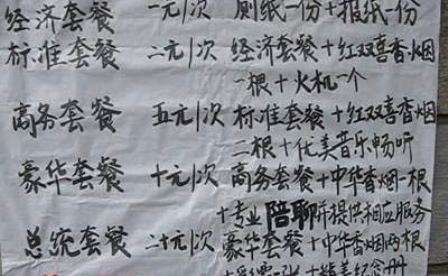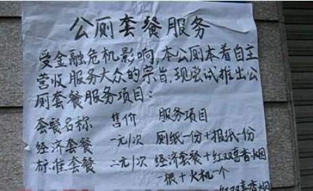 據(jù)悉,告示上將該項服務(wù)分為五個等級,分別是經(jīng)濟(jì)套餐、標(biāo)準(zhǔn)套餐、商務(wù)套餐、豪華套餐、總統(tǒng)套餐。每個套餐還列出了各自的服務(wù)項目。例如經(jīng)濟(jì)套餐就贈送廁紙一份、報紙一份,收費也相當(dāng)?shù)土瑑H僅需要一元;2元的標(biāo)準(zhǔn)套餐則在經(jīng)濟(jì)套餐的基礎(chǔ)上送出紅雙喜香煙一根火機(jī)一個。最雷人的應(yīng)該算是價值10元的豪華套餐,竟然有專業(yè)陪聊的服務(wù)項目。而20元的總統(tǒng)套餐也讓人摸不著頭腦,居然包括彩票一張和精美紀(jì)念冊。這些都讓網(wǎng)友們好奇不已:不知道當(dāng)你如廁的時候,有人在一旁陪你談心,會是什么樣的感受?而精美紀(jì)念冊的內(nèi)容,又會是什么?