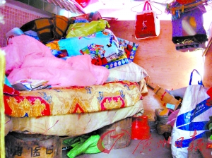 小窩棚里面有一個(gè)破舊的床墊,用木桶、磚塊等胡亂墊高。又臟又潮濕的被子等日常生活用品和阿婆撿回來(lái)的一些廢品雜亂地堆放在床上和底下,散發(fā)著一股難聞的氣味。