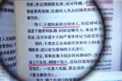 據(jù)悉,2006年,海淀城管分隊副隊長李志強執(zhí)法時被小販崔英杰刺死后,北京城管對隊員進行了如何防止暴力抗法的培訓(xùn)。在一次針對科級以上(含副科級)人員的培訓(xùn)班上,曾使用過這本教材。但很快有城管隊員發(fā)現(xiàn)教材的用詞有問題,并對此提出了質(zhì)疑。此后,這本教材就再未使用過。