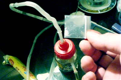 燈一打開,只見茶幾上擺著吃剩的生日蛋糕,3個(gè)用來(lái)吸食新型毒品的瓶子,臥室桌上也擺著瓶子,散落著大量的塑料吸管。之后,該房間的6男3女全部被帶回分局進(jìn)行尿檢,證明均吸食了麻果。
