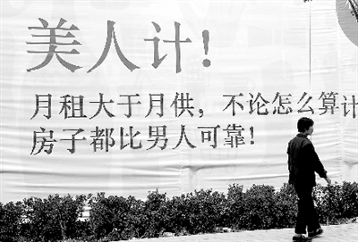 “寧可相信世上有鬼,也不能相信男人那張嘴。”這句眾女傳閱調侃男性的話語,近日卻被變相地搬上臺面,成為商家奪人眼球的廣告語。“月租大于月供,不論怎么算計,房子都比男人可靠!”近日,棉紡東路某房產商的一條廣告引發(fā)了一場關于廣告與男性尊嚴的爭論。