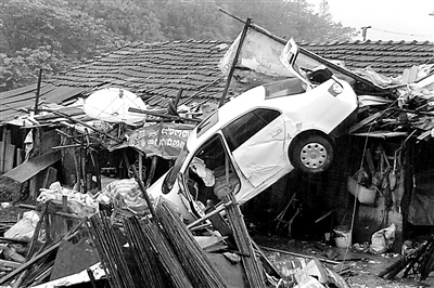 昨日上午,記者趕到現(xiàn)場(chǎng)看到,一輛“受傷”的白色轎車車頭朝下,車尾朝上,倒立著“掛”在民房的屋頂上,轎車車頭撞得面目全非,車身兩側(cè)凹陷,車內(nèi)兩個(gè)安全氣囊也完全打開(見圖)。民房旁邊,一根水泥電桿攔腰被撞斷,地上還散落著汽車零部件,不少路人冒雨在看稀奇。