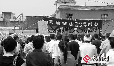 昨日上午11點(diǎn),包志堅(jiān)、周湛萍的追悼會(huì)在盈江縣人民醫(yī)院新家屬小區(qū)內(nèi)舉行,來(lái)自社會(huì)各界的上千人自發(fā)前來(lái)沉痛悼念,不時(shí)有單位、個(gè)人的花圈送抵現(xiàn)場(chǎng)。