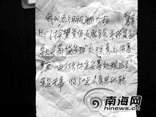 楊警官要求蔡某寫(xiě)下一張收條,蔡某當(dāng)場(chǎng)寫(xiě)道:我以老鄉(xiāng)朋友身份為楊警官上門探望受傷女服務(wù)員,并找其領(lǐng)導(dǎo)上司商談妥協(xié)處理意外傷害事宜,由雙方協(xié)定妥善處理達(dá)到平安無(wú)事,收了一點(diǎn)小意思的錢。
