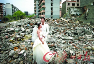 2009年4月21日下午,在(四川綿竹縣)漢旺鎮(zhèn)舊城東汽中學(xué)的殘?jiān)珨啾谏铣霈F(xiàn)美麗感人的一幕:曾救出“可樂男孩”薛梟的志愿英雄陳巖與穿著潔白婚紗的妻子彭露在這里拍下婚紗照,以紀(jì)念他們動人愛情的永恒紀(jì)念。