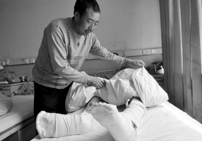 高煥東醫(yī)生告訴記者,小陳的腰1、2、4節(jié)椎體壓縮性骨折,左小腿粉碎性骨折,右足3、4、5節(jié)蹠骨骨折,右跟骨骨折,現(xiàn)在還在進(jìn)一步治療恢復(fù)中。而小陳的父親告訴記者,目前已花了5萬(wàn)多元錢(qián),向親戚朋友借遍了錢(qián),已經(jīng)無(wú)力繼續(xù)治療了,只能提前出院。