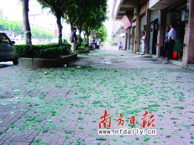 昨日,記者再次來到事發(fā)地看到,警方仍未解除警戒線,幾名民警在現(xiàn)場緊張勘察。事發(fā)街道兩旁的玻璃碎片仍是灑落一地,離爆炸核心位置20多米遠的一家修理店老板介紹,很多玻璃碎片都是從對面街道飛過來的,他指著一塊插入卷閘門的石頭說:“這個也是從對面飛過來的,當(dāng)時爆炸的威力太可怕了。”