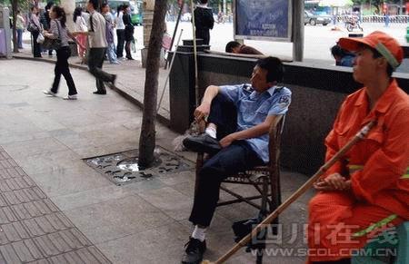 昨日,照片里的主角,宜賓市翠屏區(qū)市容管理局南城中隊協(xié)管員李劍勇表示,單位領導已批評教育他了,自己影響了宜賓和宜賓城管的形象,他表示非常抱歉。“當時所有的攤點都已規(guī)范位置了,想坐著休息下!崩顒τ抡f,城管協(xié)管員沒有固定工作點,他便在游攤最易出現(xiàn)的南門橋頭坐著休息會兒,他希望所有的城管隊員都將他作為反面教材,在以后的工作中注意紀律和形象。