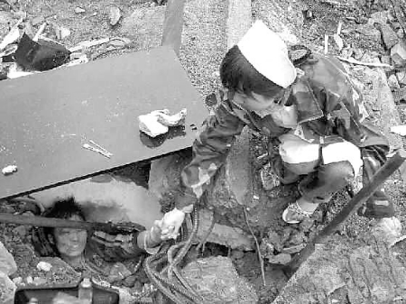 廢墟里,一個(gè)少年被扭曲的鋼筋、預(yù)制板埋著,眼神里流露出對(duì)生的渴望;廢墟外,一名穿涼鞋的女護(hù)士,左手提著一袋血漿,右手和少年的左手緊緊握在一起。地震中,這張照片被網(wǎng)友們稱為“汶川大地震中最感人的十大鏡頭”,照片中的女護(hù)士顧云仙,被網(wǎng)友們稱為“最美女護(hù)士”。