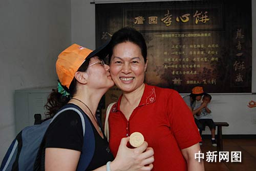中新網(wǎng)廣州5月10日電(記者 莫非 通訊員 黃翠萍)“媽媽,我愛(ài)你!”在廣東中山詹園孝心餅制作大賽中奪得冠軍的劉女士給母親送上了深情一吻,也第一次送上了親手做的孝心餅,這讓劉媽媽笑開(kāi)了懷。