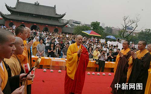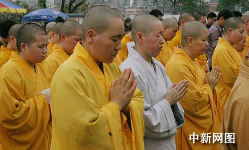中新網(wǎng)重慶5月12日電 (孟幻 張晅)12日,汶川大地震周年祭之時(shí),重慶佛教界人士在重慶華巖寺舉行悼念及祈;顒(dòng)。14時(shí)28分,在場(chǎng)僧眾及300余位信眾默哀3分鐘。隨后,華巖寺方丈道堅(jiān)法師帶領(lǐng)僧眾舉行祈福消災(zāi)法會(huì),為汶川地震災(zāi)區(qū)誦經(jīng)祈福,同時(shí)祈求風(fēng)調(diào)雨順,國泰民安。完