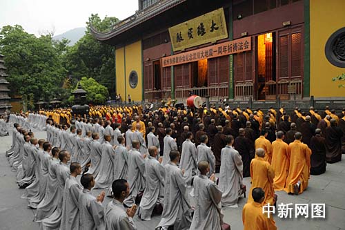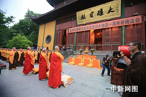 中新網(wǎng)杭州5月12日電(記者 柴燕菲 見(jiàn)習(xí)記者 周翌)一年前的今天,巴蜀大地一聲長(zhǎng)嘆,舉國(guó)旗半落以致哀,笛長(zhǎng)鳴以悲愴。一年后的今天,巴蜀大地重獲新生,如鳳凰涅磐。一年來(lái),汶川的陣陣喘息,步步前進(jìn)都牽動(dòng)著全國(guó)人民的視線。2009年5月12日16時(shí)30分,杭州市佛教界各大寺院300余僧眾會(huì)聚千年古剎靈隱寺,隆重舉行汶川大地震一周年祈禱法會(huì)。