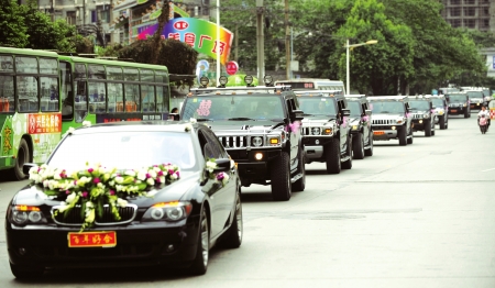 奔馳越野車作為拍攝車,主婚車是一輛寶馬7系轎車,后面跟著的則是12輛扎著粉色氣球的悍馬H2……昨日上午,這支婚車隊伍在成都合江亭一亮相,立即引起眾人的驚嘆,市民紛紛掏出手機和相機拍照。有人算了一筆賬,這支豪華婚車隊伍的車輛價值上千萬元,實屬難得。