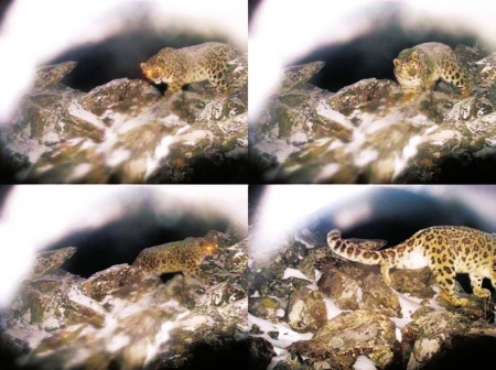 “從照片看,這些雪豹應該至少是兩只!迸P龍?zhí)貏e行政區(qū)資源管理局副局長徐海斌特別興奮,據(jù)他說,從照片上看,拍攝的應是成年雪豹,且體型健美,毛色發(fā)亮,做掌握方向“舵”的尾巴靈敏,特別是眼睛兇猛異常,證明其身體健康狀況十分不錯。據(jù)了解,今年臥龍同北京大學合作的監(jiān)測項目中,他們首次在海拔4400米以上安裝了兩臺700萬像素的紅外線相機,也是專門加強對雪豹等珍稀野生大型肉食性動物的專項監(jiān)測,沒想到未滿半年就有了收獲。