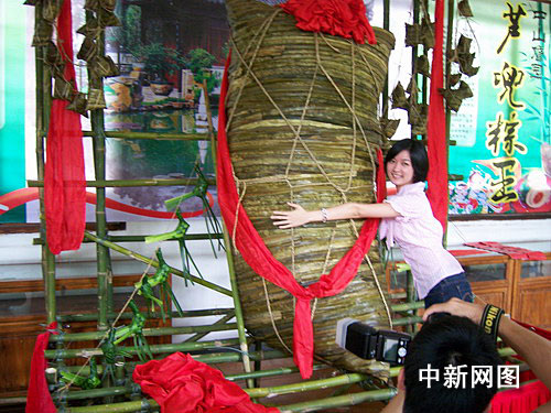 這個(gè)端午節(jié)小黃金周,在嶺南最大的古典私家園林中山詹園里,游客可以親自見證1.88米高的巨無霸蘆兜粽。該巨無霸大粽子由中山傳統(tǒng)裹粽大師,用了三天時(shí)間,動(dòng)用數(shù)百斤包括糯米、紅綠豆、豬肉等材料制作而成。5月26日,1.88米巨型蘆兜粽現(xiàn)身在詹園!斑沒見過這么大的粽子!”游客劉先生驚訝地說。目見如此龐大的巨粽,游客們都紛紛爭(zhēng)先上前留影。
