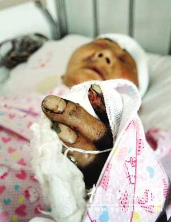 在南京軍區(qū)總醫(yī)院的一張病床上,記者見到正在輸液的李步琴老人,她頭部、手部纏著厚厚紗布。記者了解到,不連頭上的傷,老人手指、鎖骨、肋骨五處骨折,還餓了4天,老人現(xiàn)在已經(jīng)恢復(fù)了神志,思維敏捷,不能不說(shuō)是個(gè)奇跡。老人告訴記者,5月19日傍晚她和工程隊(duì)開挖土機(jī)的吵了一架,因?yàn)樗麄兺趬牧俗约旱牟说亍.?dāng)天晚上8點(diǎn)多鐘,突然有個(gè)人沖進(jìn)她居住的泵房,進(jìn)門就跟她要錢。剛開始她以為遭遇劫匪,無(wú)奈之下,只好從口袋里掏出一張皺巴巴的百元鈔票,可對(duì)方拿到錢后,仍不罷休,竟然揚(yáng)言要火燒房子。還不問青紅皂白,甩起一根棍子就朝她頭上夯,她雙手抱住頭,棍棒繼續(xù)擊打在她的頭上、身上,直到她昏死過去。老人居住的地方?jīng)]有水電,因此當(dāng)時(shí)光線黑暗,她沒有看清楚對(duì)方什么樣子,但是她記得對(duì)方毆打她的時(shí)候曾經(jīng)問過她:“以后還給不給開路?”這個(gè)“開路”是什么意思?老人解釋說(shuō),她的菜地占了挖掘機(jī)的路,她曾經(jīng)與對(duì)方交涉過多次。
