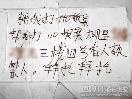 “幫我打110報案……有人軟禁人,拜托拜托!弊蛉障挛2點,家住成都大觀里某小區(qū)的一位大爺正在小區(qū)內(nèi)散步,突然,一張硬紙條歪歪扭扭地從三樓窗戶飄落下來,大爺拾起一看,大吃一驚,立即將紙條交給小區(qū)門衛(wèi)。5名警察接警后立即出動……