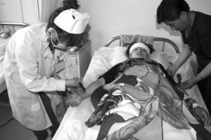 2日7時(shí)許,記者坐了一夜火車趕到集賢縣。一下車就來到集賢縣第一人民醫(yī)院住院處。此時(shí),農(nóng)用三輪車上的傷者已被分別安置到四樓與五樓的病房。今年53歲的張某是繁榮村的村民,此次事故中他腰椎骨折、右腿腿骨斷了兩節(jié)、左腿脫臼, 身體無法動(dòng)彈。張某的家人坐在病床旁,正給他擦洗雙手,等待護(hù)士為他靜點(diǎn)。