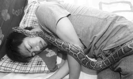 年輕人飼養(yǎng)另類動物已不足為怪,但住在武昌梨園附近26歲的趙晶養(yǎng)了緬甸蟒、平原巨蜥、蝎子等多種動物,他工資的大部分都用來飼養(yǎng)動物了。更讓人驚訝的是,他常年與蟒蛇同床共眠。