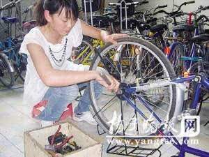 在無(wú)錫商業(yè)職業(yè)技術(shù)學(xué)院創(chuàng)業(yè)教育園里面有一家“奇·騎車行”,主營(yíng)自行車租賃和維修,在整個(gè)藕塘職教園區(qū)都很有知名度。讓人想不到的是,這家車行的“主人”竟然是一名23歲的在校女大學(xué)生,一位自行車的維修高手。昨天,記者在學(xué)校里見(jiàn)到了這位來(lái)自連云港的大三女孩姚莉娟。小姚給人的第一印象就是身材高挑,漂亮大方,大學(xué)生美女這些詞匯怎么也和修車掛不上關(guān)系。自從愛(ài)上修車之后,她整天和油污、機(jī)械打交道,靠著自己的勤勞和智慧,被大家稱為大學(xué)里的最美“修車匠”。
