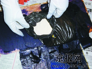民警拿過嫌疑人手中的藍色手提包進行檢查,發(fā)現(xiàn)提包底部的夾層鼓鼓囊囊,打開一看,原來是層層包裹的白色海洛因,重約0.7公斤。經(jīng)初步審查,前來接頭的男子姓羅。偵查員根據(jù)掌握的情況,迅速趕往海淀某小區(qū),對男子阿某在北京的暫住地進行搜查,成功起獲了數(shù)個塑料袋包裝的1.1公斤海洛因毒品。