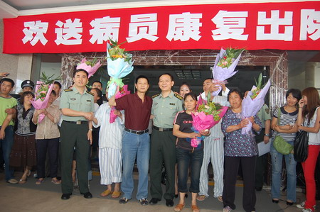 下午三點(diǎn)半,9名已康復(fù)的傷員在醫(yī)務(wù)工作者和家屬的陪同下走出了外科樓。四川省衛(wèi)生廳副廳長趙萬華與該醫(yī)院部分領(lǐng)導(dǎo)向傷員們贈送了鮮花,并握手、拍照留念。