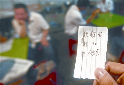吃飯間,一名女子始終低著頭,機(jī)械地往嘴里扒飯。一旁的一男一女興致高漲,不停地說話,操著外地口音。幾分鐘后,這一男一女從餐桌起身,走到餐館門口打稀飯。這時(shí),坐在桌旁的女子迅速塞來一張紙條。王師傅的妻子嚇了一跳,她走到廚房,展開蜷曲的紙條,上面赫然寫著“救救我,打110”(見圖)。王師傅趕緊報(bào)警,他擔(dān)心對(duì)方在民警來前就離開,還一再叮囑妻子,如果對(duì)方付錢結(jié)賬,就盡量拖延時(shí)間。