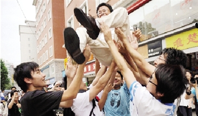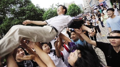 高考最后一門英語結(jié)束了,對緊繃的高三學(xué)生來說,這是一個(gè)歡樂的時(shí)刻,輕松的時(shí)刻。周南中學(xué)十幾名高三學(xué)生,剛走出長沙一中考點(diǎn),便將班主任吳老師舉起拋向了空中。