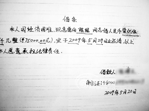 一會,小鋒看到阿東將他的朋友阿冠從另一個包廂里請進來!靶⌒值埽铱梢越杞o你3.5萬元,但10天后你要還給我7.5萬!卑⒐谂牧伺男′h的肩膀,小鋒左右為難,想拒絕,但是又害怕對方不讓自己離開。 “好,我同意!眲e無選擇的小鋒咬了咬牙,他按照對方所念的話寫下了借條。為取信于小鋒,阿冠還當面將3.5萬元付給阿東。