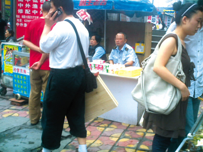 6月13日,網(wǎng)友“透明”在大渝網(wǎng)發(fā)帖稱(chēng),當(dāng)日他前往楊家坪辦事,看到一個(gè)光頭城管正在幫一個(gè)小販看攤,詫異之余用手機(jī)拍下了這一幕。記者從照片中看到,在人行道上,一個(gè)由一把太陽(yáng)傘和一個(gè)玻璃柜臺(tái)組成的雜貨攤后面,該城管正悠閑地坐著,似乎很享受守?cái)偟母杏X(jué)。
