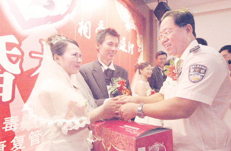 在鞭炮聲中,新郎們把身著婚紗的新娘接回康復所為他們免費提供的新房。之后,隨著婚禮進行曲響起,3對新人相挽著步入康復所內布置的婚禮儀式現場。廣東電視臺主持人侯玉婷為他們主持了婚禮儀式,廣東省戒毒管理局局長施紅輝為3對新人證婚。施紅輝說:“這是全國戒毒康復場所的首次集體婚禮!