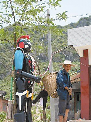 昨日,記者在這則《真牛,村民把變形金剛當門神》帖子的照片上看到,一個巨大的黑色變形金剛模型,筆直的立在一民房外的木桿旁,從模型身上連接的電線可以看出,這應(yīng)該是一個電動玩具,變形金剛旁還站著一位背著背簍,戴著草帽,滿臉黝黑的老伯,似乎對身邊的模型早已習(xí)以為常。
