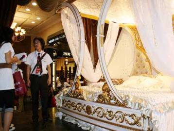 走進(jìn)五號(hào)館展場(chǎng),幾乎所有人的目光都會(huì)立即被成都本土企業(yè)制造的一張價(jià)值五十萬元人民幣的豪華大床所吸引。據(jù)制造商介紹,這張價(jià)值五十萬元人民幣的豪華大床是用橄欖木材耗時(shí)六個(gè)月純手工雕刻而成,“這張床的設(shè)計(jì)理念取意于西班牙古代皇室風(fēng)格。除做工精美外,整張床還鑲嵌了純金箔和二十六顆施華洛世奇水晶,目前單張床的市場(chǎng)售價(jià)在五十萬元人民幣以上!