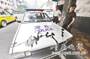 昨日,長航公安局朝天門派出所門前停車場(chǎng),有不法人員惡作劇:先后在包括兩輛警車在內(nèi)的4輛車上用油墨涂鴉。警方稱,惡作劇者涉嫌故意損毀公私財(cái)物,可處10日以上15日以下拘留,并處罰款1000元。