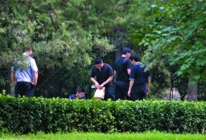 王明說,起初,藍衣男子出門后向東逃跑,跨進了銀行旁的綠化帶,然后向南前行了幾步,隨即馬上轉身,沿反方向跑去。到達銀行對面的綠化帶時,他和保安堵住了該男子。但藍衣男子沖著二人將瓶子里的無色液體灑出,隨后繞開他們,繼續(xù)向北跑去,很快就不見蹤影。