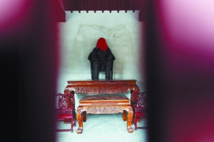 這座尚未完工的四合院風格祠堂,朱紅色的圍墻四周,花崗巖雕成的石欄環(huán)繞。院內東西廂房內分別擺設著整體浴缸和木質仿古雕木床。正房中擺放著一座3米高的銅像。