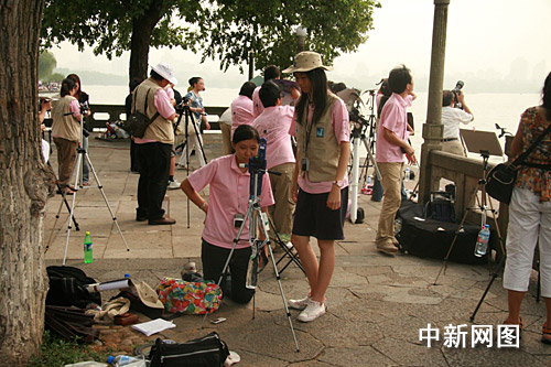 雖然臺(tái)灣的天文愛好者都知道天氣情況,但是早晨6時(shí)左右,距離日全食還有兩個(gè)多小時(shí)的時(shí)間,在杭州西湖十景之一的平湖秋月處,這批來自寶島臺(tái)灣的天文愛好者便早早靜候天文奇觀的到來。
