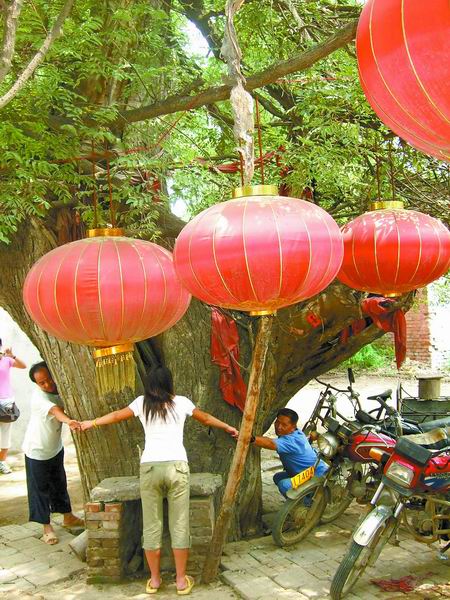 “這棵樹可有年頭啊!”村民楊更偉說,這棵大槐樹已有一千多年的歷史,樹干周長將近5米,5個成年人才能把這棵大槐樹環(huán)抱住(如圖),偶爾會有人在樹下燒香,樹洞里布滿了蜘蛛網(wǎng),一直沒人管理。
