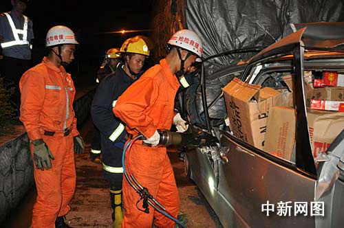 消防官兵隨后展開施救工作。由于車頭變形嚴重,消防官兵只得輪流使用消防撬棍、液壓剪擴器和切割機將兩邊的車門打開,然后將車上香煙搬出,再把兩人的座位靠背放直,兩名被困人員才得以依次抬出。經(jīng)現(xiàn)場120急救人員證實,兩人已經(jīng)死亡。