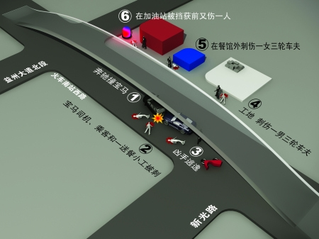 昨日中午12時許,一輛奔馳車和一輛寶馬車在(成都市)火車南站西路追尾。車禍發(fā)生后,奔馳車司機用兇器刺傷寶馬車上兩名女子和一名送餐小工。據(jù)知情人士稱,寶馬車上一名女傷者是市內(nèi)某大型家具城老板的妻子。隨后,奔馳車司機往火車南站方向跑去,一路上,先后刺傷了兩名火三輪司機,最后跑進(jìn)距現(xiàn)場100多米的加油站,在刺傷一人后,被眾人合力捉住。