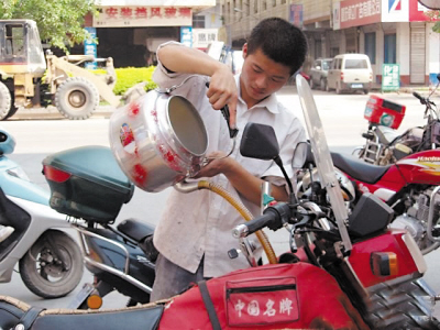 網(wǎng)友“墜入情!痹谔又蟹Q,該加油站位于開縣移民新城南山中路!白钆5木褪怯靡粋大水壺給摩托車加油”。加油站準備了幾個大水壺,壺嘴上都安上一節(jié)水管,每個水壺連壺蓋都沒有。摩托車司機需要自己拿水壺到加油機前打油,加油站工作人員也不管。發(fā)帖者說:“汽油是一種很容易揮發(fā)的物質(zhì),但壺口是敞開的,在加油過程中,大量的汽油極易揮發(fā)出來,加油站彌漫著一股刺鼻的汽油味道,存在著嚴重的安全隱患!