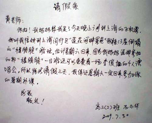 網(wǎng)友發(fā)帖稱:每一年的暑假,有關(guān)教育部門都會(huì)三令五申嚴(yán)禁補(bǔ)課,但是各種補(bǔ)課現(xiàn)象卻仍然屢禁不絕,有人強(qiáng)烈反對(duì),也有人表示贊同。然而在廣州,一位女家長(zhǎng)為參加某旅行社的“一日游”,竟然讓讀高三正在參加學(xué)校暑期補(bǔ)課的兒子請(qǐng)假,陪同其到上海旅游,該家長(zhǎng)的舉動(dòng)實(shí)在費(fèi)疑所思!這是一張普通的學(xué)生請(qǐng)假條,但內(nèi)容卻讓人大為吃驚!想不到該高中生請(qǐng)假的理由是:“媽媽叫我陪她到上海閔行區(qū)“蓮花河畔景苑”那棟13層倒塌的‘樓脆脆’游玩!闭(qǐng)假條上還說(shuō),參加上!皹谴啻唷币蝗沼芜可以免費(fèi)看一場(chǎng)李俊旭個(gè)人演唱會(huì)。一日游還可以看演唱會(huì)?難怪這么有吸引力,也不知道這家旅行社怎么會(huì)那么牛的!請(qǐng)假條是廣州某高中一位女教師的QQ空間流傳出來(lái)的,目前真實(shí)性還不能確定。