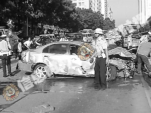 目擊事故的一名女清潔工說,白色小車當(dāng)時的車速很快,突然就徑直撞向路中心護(hù)欄,同時發(fā)出一連串的撞擊響聲!斑@樣猛的撞車,司機(jī)竟然能保住大命,車也沒起火,太幸運(yùn)了!”