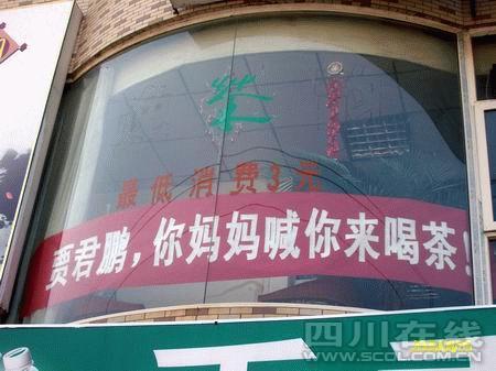 再三追問(wèn)下,來(lái)自重慶農(nóng)村的陳先生如實(shí)說(shuō),他平時(shí)喜歡上網(wǎng),看到“賈君鵬,你媽媽喊你回家吃飯”這句新的網(wǎng)絡(luò)流行語(yǔ)后,一下子勾起了自己童年的回憶,想起那個(gè)時(shí)候,每天傍晚,媽媽都要喊他回去吃飯的情景。而前兩天,他在網(wǎng)上看到一張照片,重慶的一家火鍋店竟然掛出一條橫幅,上面寫(xiě)著:“賈君鵬,你媽媽喊你來(lái)吃火鍋!”他頓時(shí)靈機(jī)一動(dòng):“我為什么不能依葫蘆畫(huà)瓢,也掛一個(gè)橫幅呢?”“那為什么要寫(xiě)成‘喝茶’呢?”陳先生說(shuō):“我這是茶樓,不管飯也不管吃火鍋,打麻將倒是可以,但總不能寫(xiě)成‘賈君鵬,你媽媽喊你來(lái)打麻將’噻,所以就寫(xiě)成來(lái)喝茶了。”至于這橫幅有沒(méi)有給茶樓打廣告的意思,陳先生坦言:“也許有一點(diǎn),但一來(lái)估計(jì)廣告的效果并不大,二來(lái)從自己的本意來(lái)說(shuō),娛樂(lè)的成分還要大過(guò)廣告的成分!